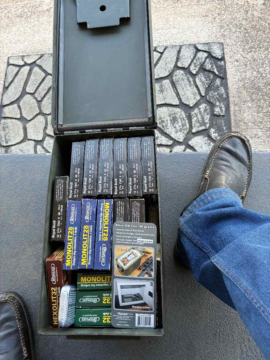 9 pellets per round… 225 rounds of buckshot and 35 rounds of slugs. Price includes metal storage can and desiccant cartridge. Various manufacturer ammo as shown in pictures. Reduced from $200 to $120.